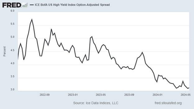You can see the trend is pretty clear. Credit concerns have been easing since late-2022. The only exception was the early-2023 spike caused by the rash of bank failures at the time.
