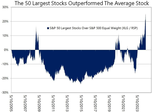 This comes after a dramatic stretch of underperformance for smaller, less-expensive stocks. Only last month, I showed you how even within the Russell Index this year, larger-cap stocks were outperforming mid-cap stocks, which in turn were outperforming micro-cap names. The same thing has been true in the S&P 500, as you can see in this chart from Forbes.com.
