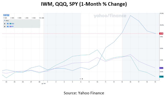 Just look at the MoneyShow Chart of the Week for July 22, 2024. It shows the 1-month percentage change in the iShares Russell 2000 ETF (IWM), the Invesco QQQ Trust (QQQ), and the S&P 500 ETF Trust (SPY). You can see the IWM has risen more than 8% during that timeframe, while the QQQs have shed 1% and the SPY is barely in the black.
